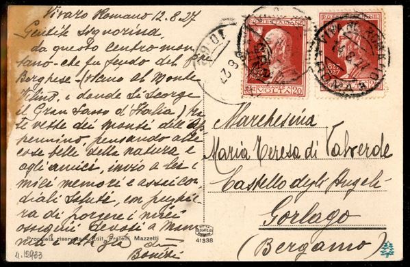 Cartolina paesaggistica affrancata con due 20 cent Volta (210) da Vivaro Romano 14.8.27 per Goriago - ex coll. Provera