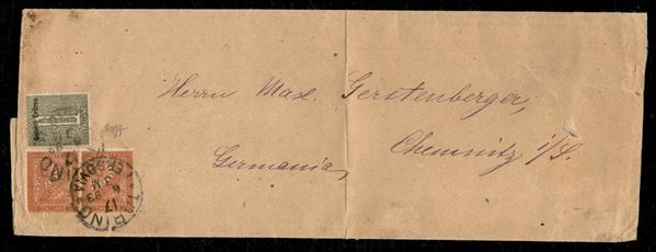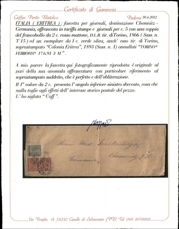 Fascetta affrancata con 1 cent verde oliva soprastampato Colonia Eritrea (1) + coppia del 2 cent Torino (T15) da Torino a Chemnitz (Germania) del 17.6.93 - interessante uso fuori dalle Colonie - cert. Caffaz