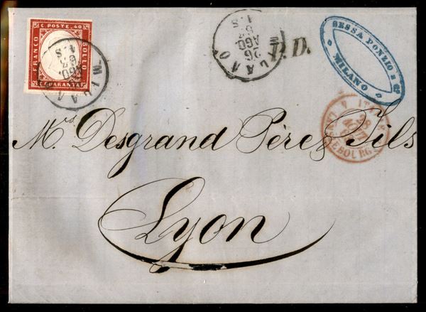 Lettera affrancata con 40 cent rosa vermiglio (16F Sardegna) da Milano a Lione del 26.8.63 - molto fresca e ben conservata