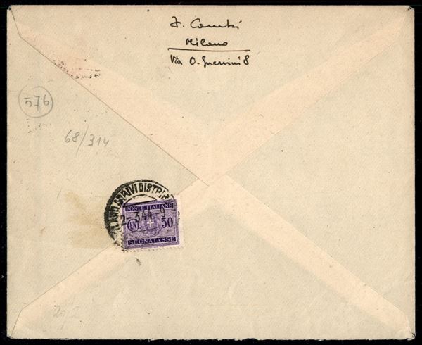 Lettera affrancata con 50 cent Posta Aerea (11) in uso frazionato con tassa al retro per 50 cent (40) - Milano 2.3.44 - Sorani