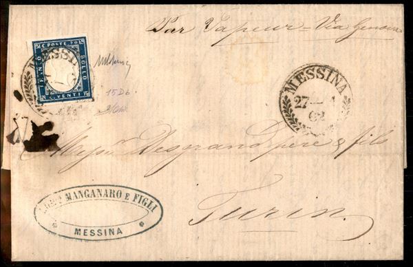Per Vapore Via Genova - 20 cent (15Db) su lettera da Messina a Torino del 27.1.62 - Oliva