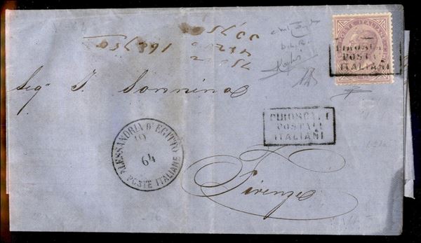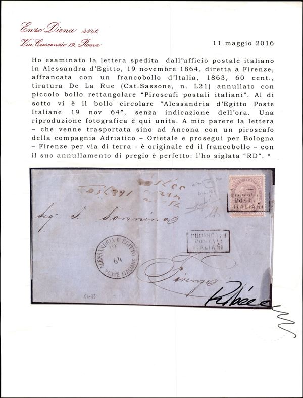 Piroscafi Postali Italiani (piccolo bollo rettangolare) su 60 cent DLR (L21) - lettera da Alessandria d'Egitto a Firenze del 19.11.64 - Raybaudi + cert. Diena
