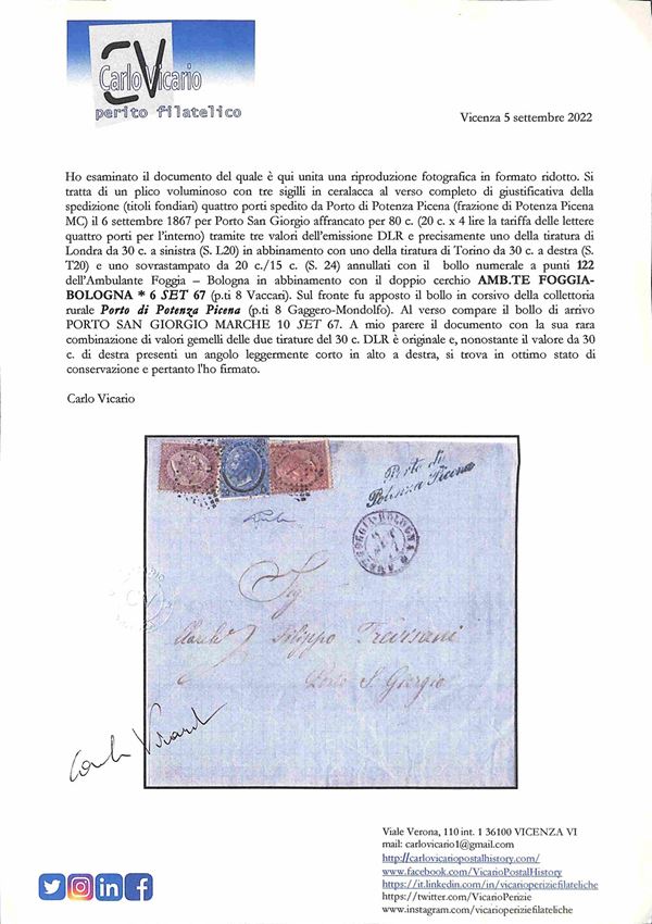 Plico affrancato per 80 cent a giustificativo della spedizione di titoli fondiari composta da un 30 cent DLR + 30 cent Torino + complementare (L19 + T19 + 25) da Porto di Potenza Picena (P.ti 8) a Porto San Giorgio del 10.9.67 - Amb.te Foggia Bologna sul fronte (P.ti 8) - unico caso finora noto dell'utilizzo delle due tirature per questo valore - cert. Vicario