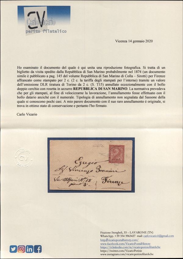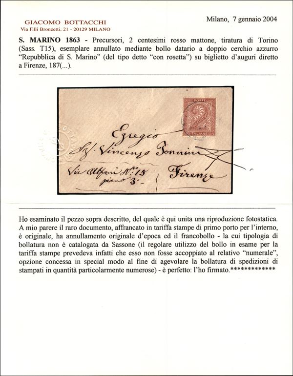 Precursori - Doppio cerchio azzurro Repubblica di S. Marino su 2 cent (E1T) - biglietto d'auguri diretto a Firenze - cert. Bottacchi + Vicario
