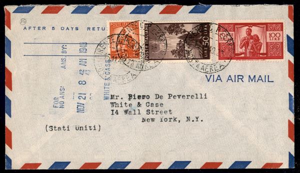 100 lire + 50 lire Democratica + 10 lire (559 + 564 + 565) su aerogramma da Firenze a new York del 15.11.49