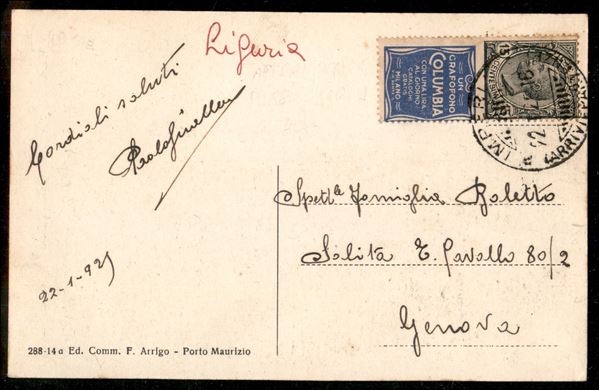 15 cent Colombia (2) su cartolina da Imperia a Genova del 22.1.25 - cartolina di Porto Maurizio