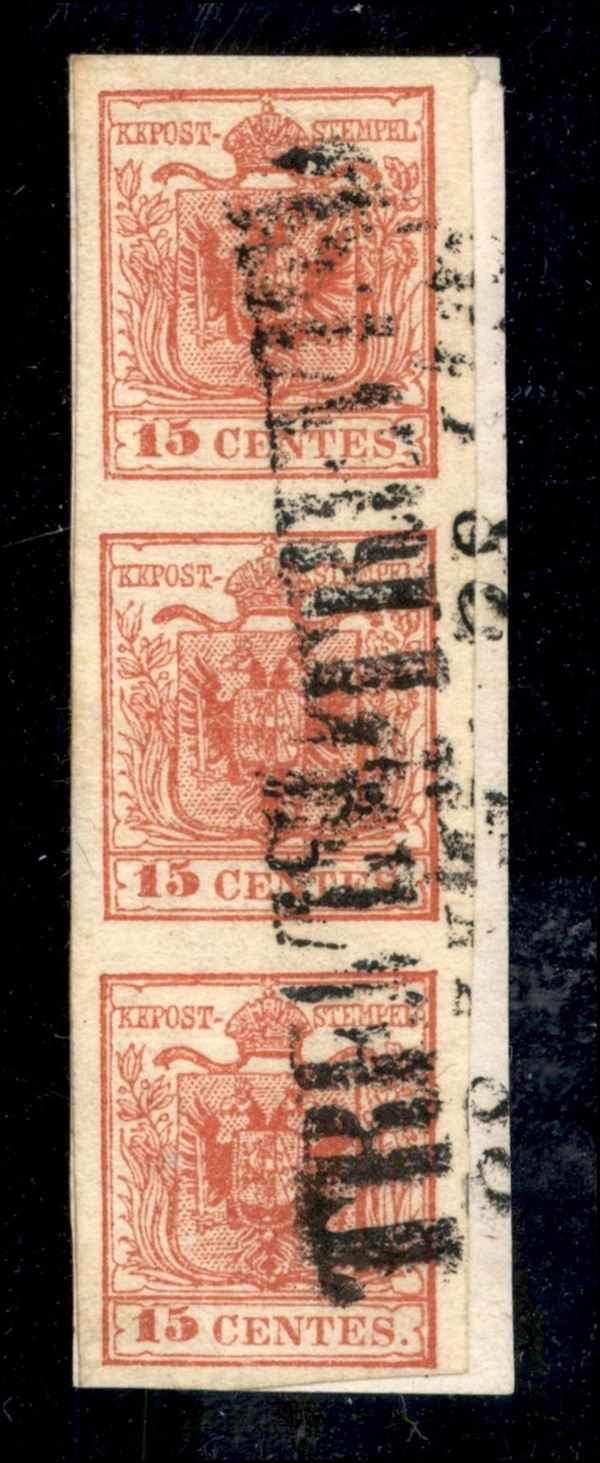 1852 - Striscia di tre del 15 cent rosso (6) III tipo su piccolo frammento - Treviso 28.7
