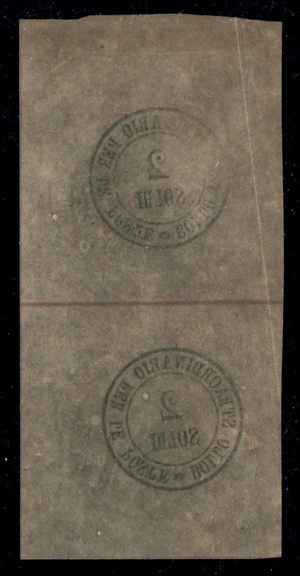 1854 - Coppia verticale del 2 soldi Segnatasse per giornali (1d) - gommati solo al recto