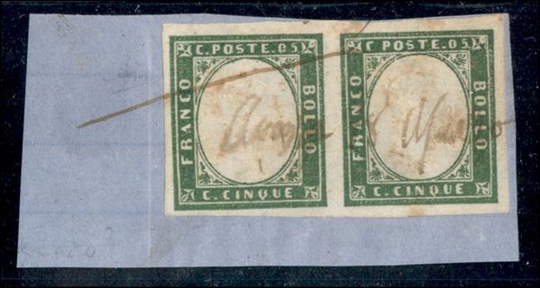 1861 - 5 cent (13Ca) - coppia orizzontale usata su frammento con annullo a penna (....18 marzo)