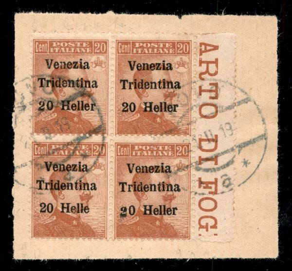 1918 - 20 heller su 20 cent (30e+30+30d+30e) - quartina bordo di foglio con errori di composizione - usata su frammento