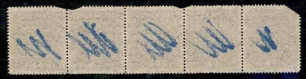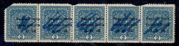1918 - Demonetizzato - 2 Kronen (15/I - fili di seta) - striscia orizzontale di cinque con soprastampe diversamente spaziate - gomma integra
