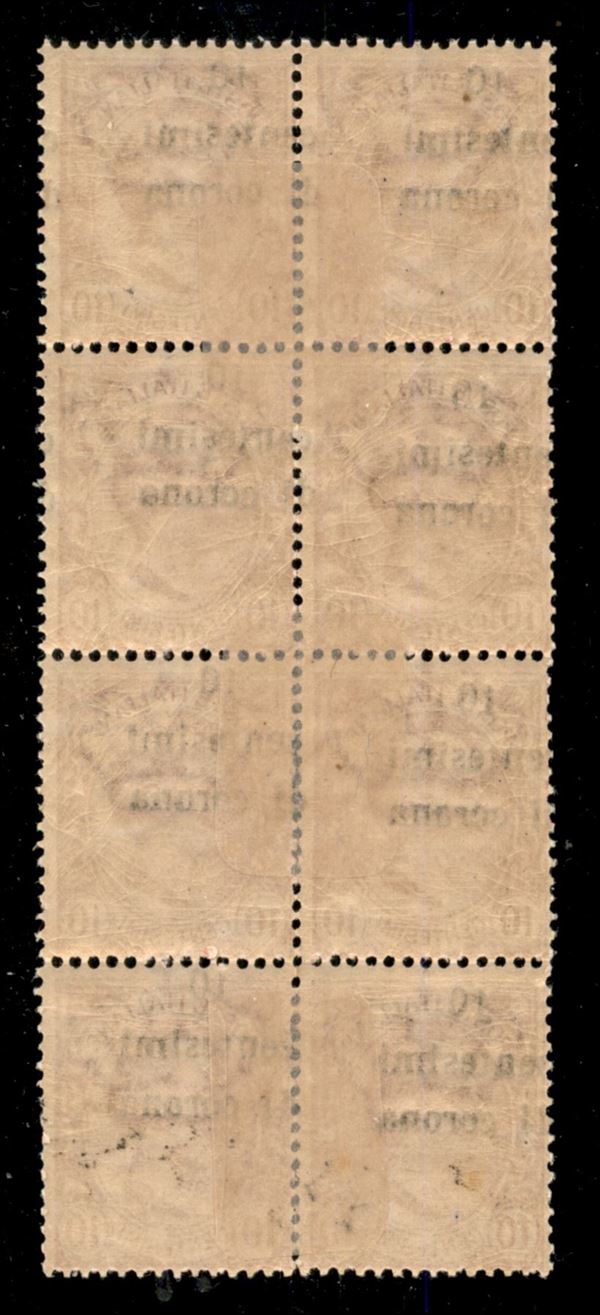 1919 - 10 cent su 10 (4 varietà u+ufd+uad) - blocco verticale di otto con soprastampa obliqua + spostata in alto + spostata a sinistra - gomma originale