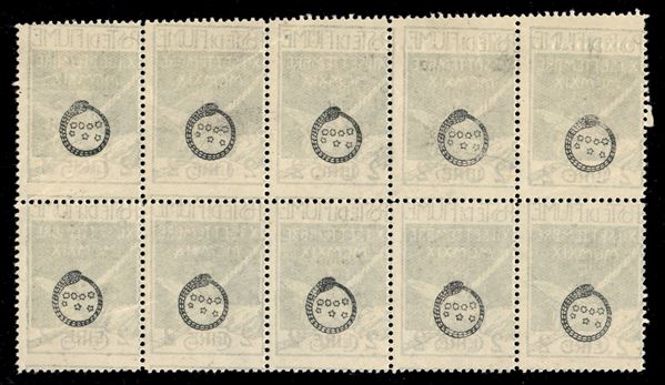1920 - 2 lire su 5 cent (144 - varietà zm + zmb) - blocco di dieci - soprastampa e dentellatura orizzontale oblique - gomma integra - insieme non catalogato - cert. AG