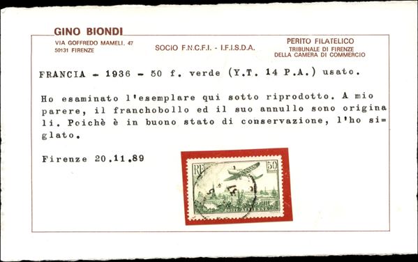 1936 - 50 franchi Posta Aerea (311) - usato - cert. Biondi