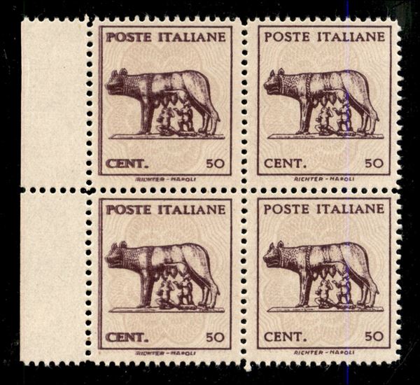 1944 - 50 cent Lupa (515Ao + 515A) - quartina bordo foglio con doppia stampa in verticale a sinistra - sempre senza gomma
