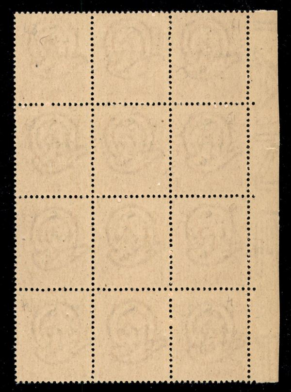 1945 - 2 lire + 6 (8) - blocco di 12 (pos. 4/73) con le varietà v + yd + ydc - gomma integra (700+)