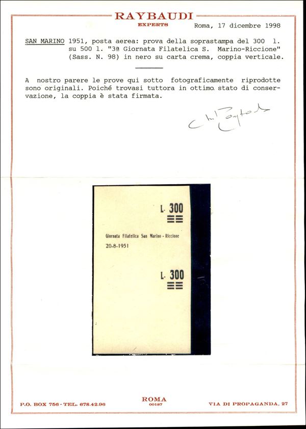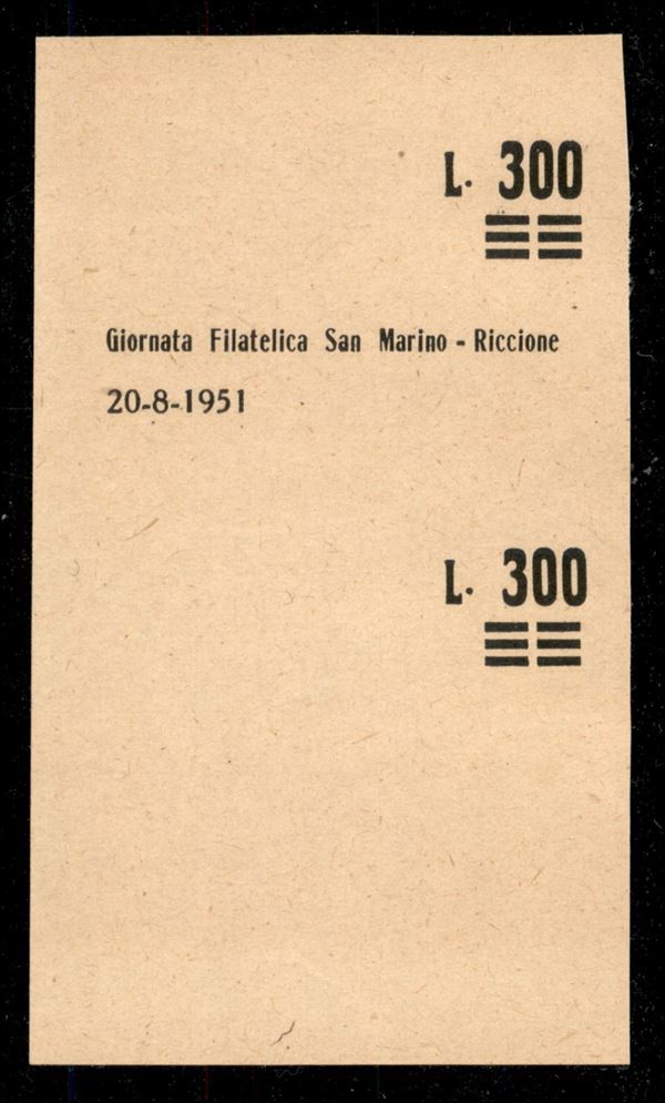1951 - Prova della soprastampa del 300 lire su 500 lire (98) in nero su carta crema - coppia verticale rasata in alto senza dicitura superiore - senza gomma - cert. Raybaudi