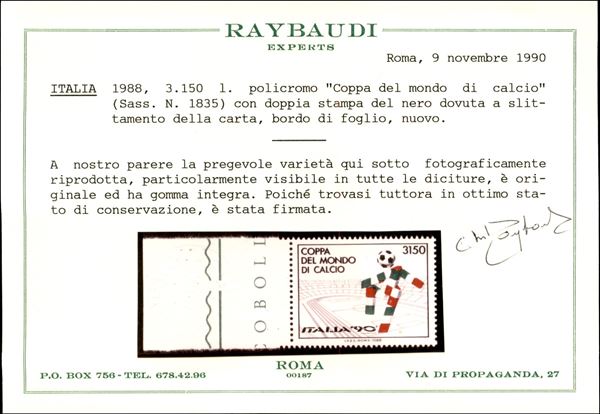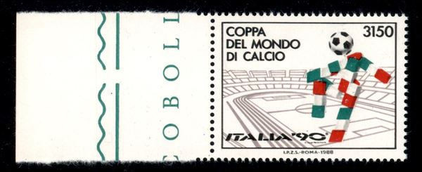 1988 - 3150 lire Coppa del Mondo (1835) con doppia stampa del nero dovuta allo slittamento della carta - bordo foglio - gomma integra - cert. Raybaudi
