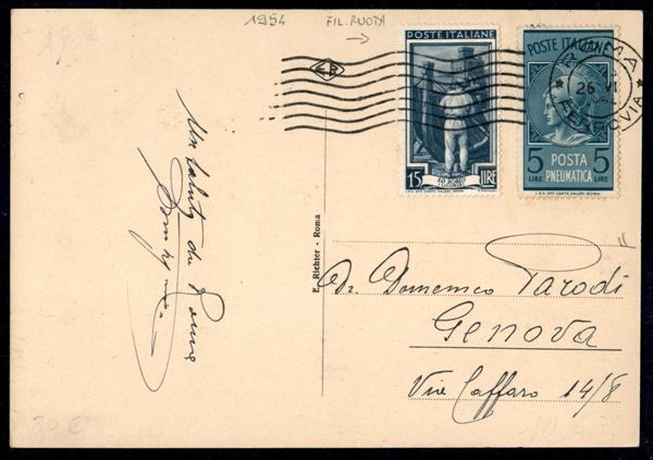5 lire Posta Pneumatica (19) + 5 lire Italia al Lavoro (641) su cartolina da Roma a Genova del 26.6.54