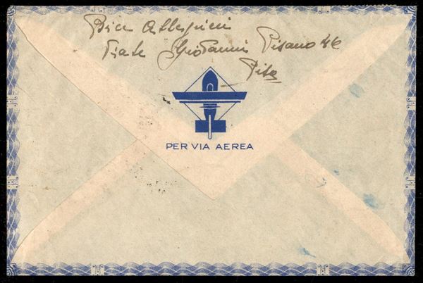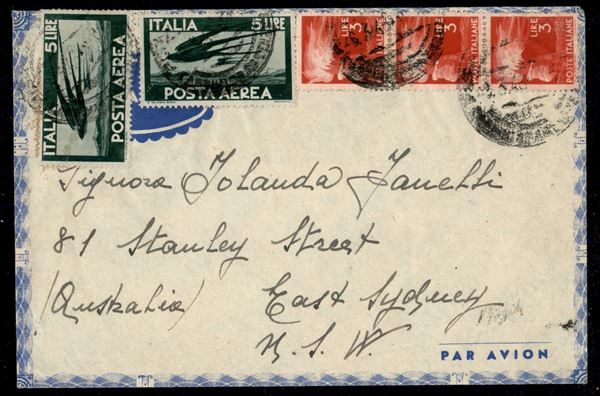 Aerogramma affrancato con valori della Democratica - striscia di tre del 3 lire (553) + due 5 lire Posta Aerea (129) da Pisa a Sydney (Australia) del 6.3.46 - destinazione non comune per questa emissione