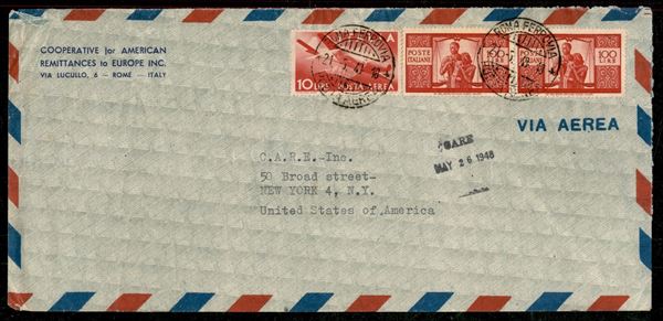 Aerogramma con coppia del 100 lire Democratica (565) + 10 lire Posta Aerea (130) da Roma a New York del 21.5.43