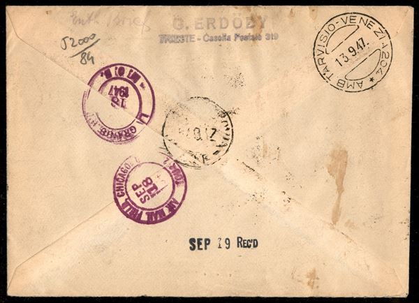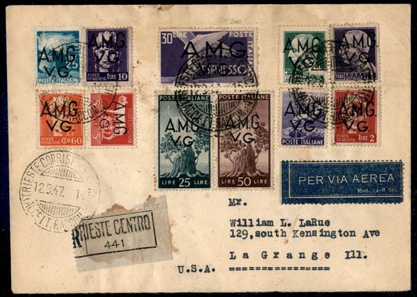 Aerogramma raccomandato affrancato con valori della serie Democratica soprastampati (7/13 + 17 + 19/20 + Espresso 2) da Trieste a La Grange (USA) del 12.9.47 - bell'insieme