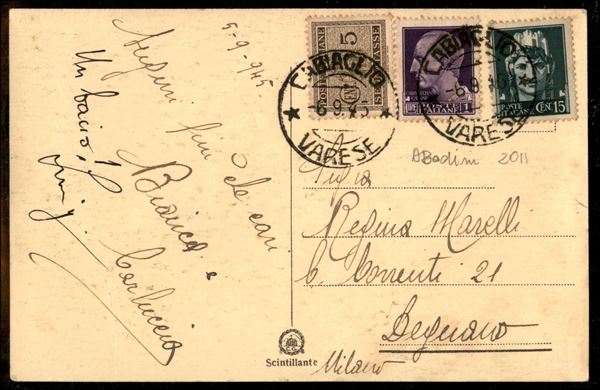 Affrancatura d'emergenza - Cartolina con 5 cent segnatasse (34) + complementari (246 + 252A) da Cabiaglio a Legnano del 6.9.45