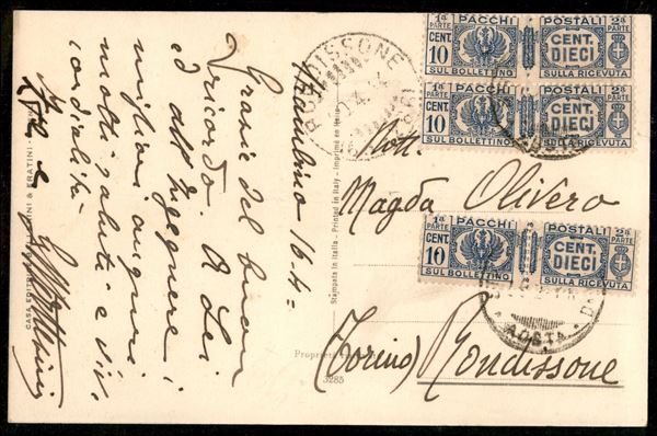Affrancatura d'emergenza - Coppia pił singolo del 10 cent Pacchi Postali (25) su cartolina per Rondissone del 16.4.44