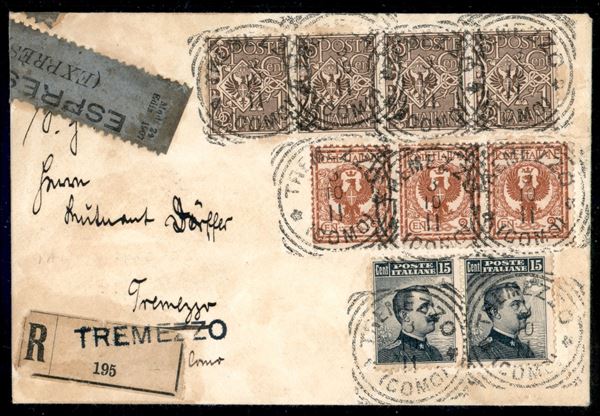 Bellissima bustina raccomandata espresso affrancata con striscia di quattro del 1 cent + striscia di tre del 2 cent + due 15 cent (68 + 69 + 86) per cittą - Tremezzo 3.10.11 - ex coll. Provera