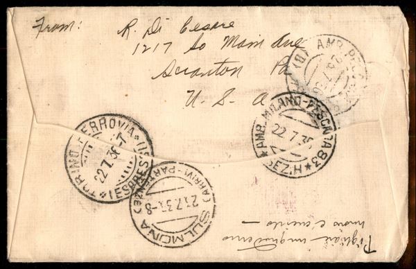 Busta espresso affrancata per 25 cent con 20 cent espresso (14) + complementare da Scranton a Sulmona del 11.7.36 - molto bella