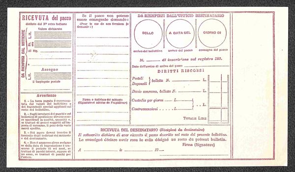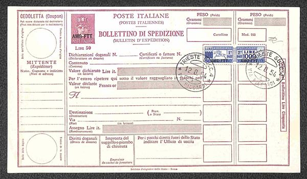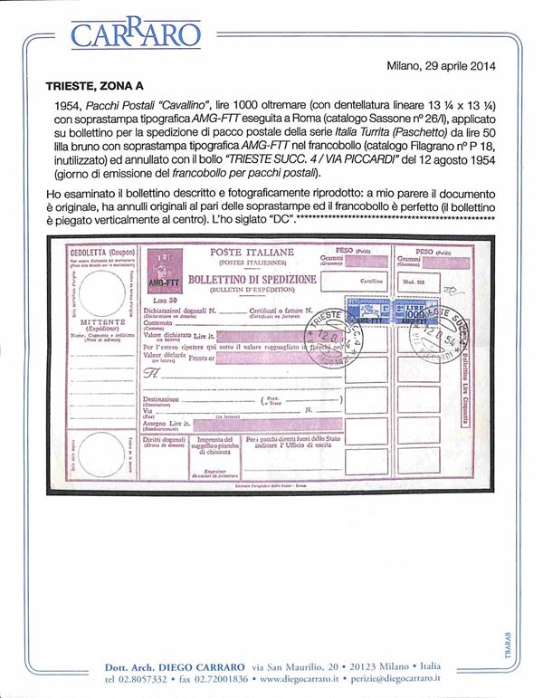 Cavallino 1000 lire Pacchi Postali (26/I) soprastampato applicato su bollettino da 50 lire Turrita (P18) non utilizzato ma annullato Trieste 12.8.54 (giorno emissione del francobollo) - molto bello e raro - cert. Carraro