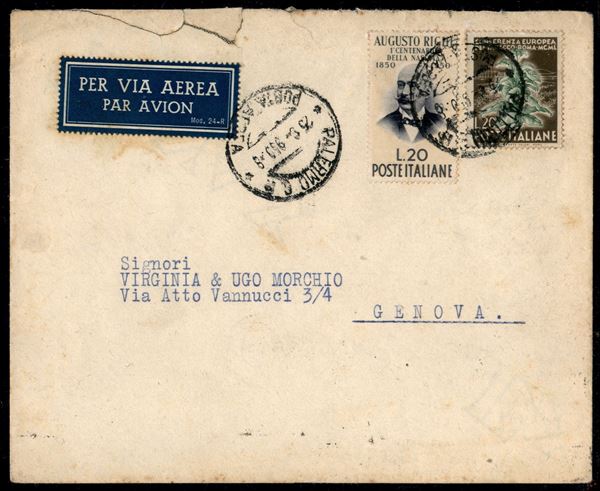Gemelli - 20 lire Tabacco (630) + 20 lire Righi (633) su aerogramma da Palermo a Genova del 25.5.50 - lettera in tariffa per l'interno con non comune combinazione in tariffa - molto bella