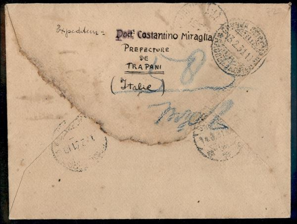 Raccomandata affrancata con coppia del 1,25 lire + 25 cent Imperiale (253 + 248) da Trapani per Surabaya (Indie Olandesi) del 10.2.31 - interessante destinazione