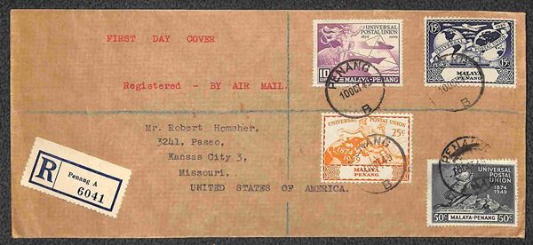 Raccomandata FDC affrancata con serie UPU da Penang a Kansas City del 10.10.49