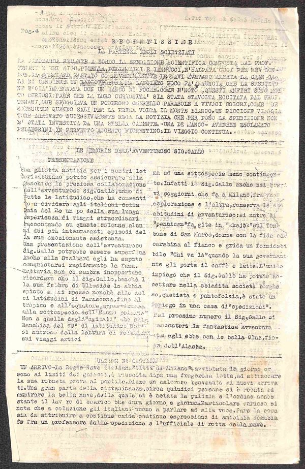 Spedizione Artica del Dirigibile Italia - 22 maggio 1928 - Giornale La Banchisa (Longhi 1798 - 280Li) - esemplare numero 1 del giornale di bordo ciclostilato su quattro facciate - splendido in perfetto stato di conservazione - molto raro - Longhi