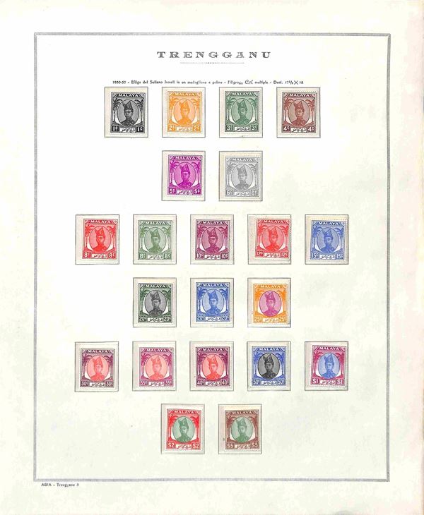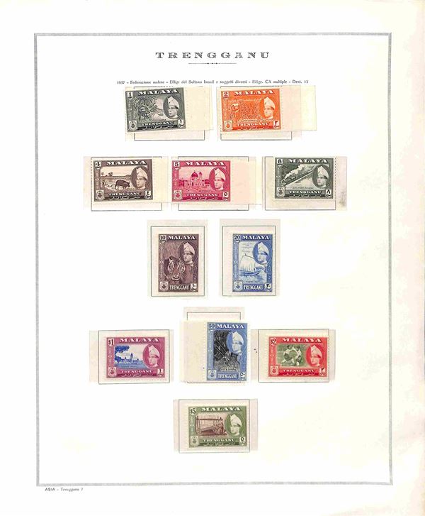 STATI MALTESI - Trengganu - 1949/1957 - Insieme di due serie complete del periodo montate in fogli in fogli Marini (54/86) - gomma integra