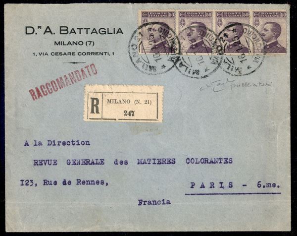 Striscia di quattro del 50 cent Pubblicitari (10/18 ? - tagliati per invio all'estero) su raccomandata da Milano a Parigi del 16.1.25 - molto bella - Raybaudi - ex coll. Provera