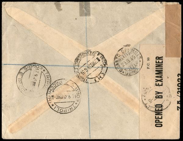 Tre valori (10/12) su aerogramma raccomandato da Tripoli a Genova del 16.9.45