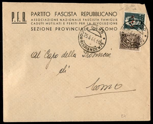 15 cent (472) + 10 cent Recapito (3 Regno) - busta da Como per cittą del 25.6.44 - Raybaudi