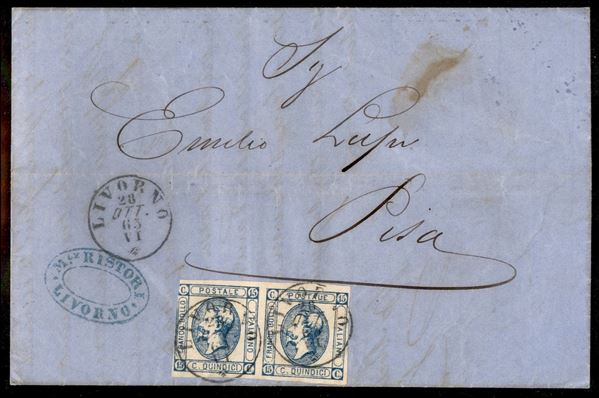 15 cent Litografico (13) - due lettere d'archivio da Livorno a Pisa con affrancature diverse (13d - 28 agosto) (13 coppia - 28 ottobre) - da esaminare