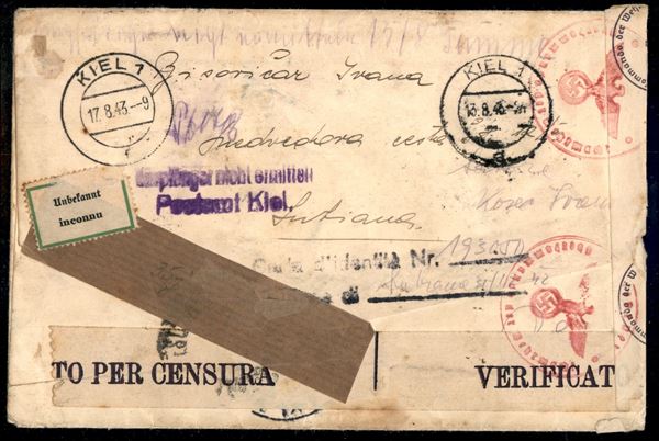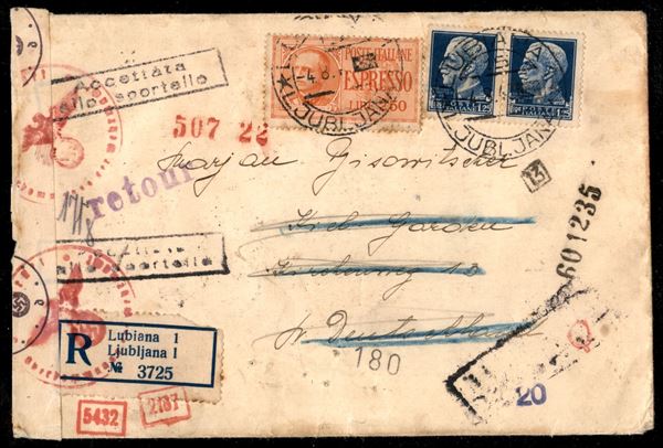1,75 lire Imperiale (253) in coppia + 2,50 lire Espresso (16) - raccomandata da Lubiana a Kiel del 4.8.43 - rispedita al mittente