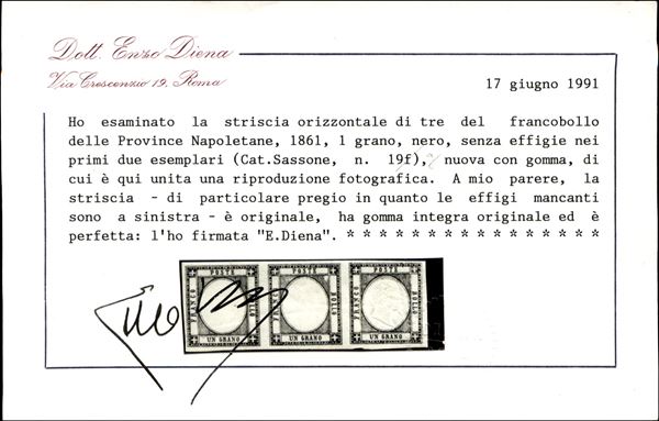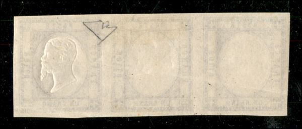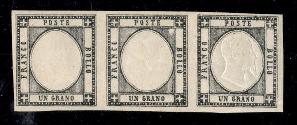 1861 - 1 grano (19 - varietà la) - striscia di tre con unica effigie a destra - gomma originale - ottimi margini - molto bella e rara - non catalogata per questo valore - cert. Diena