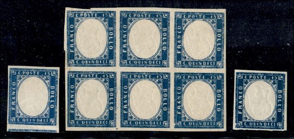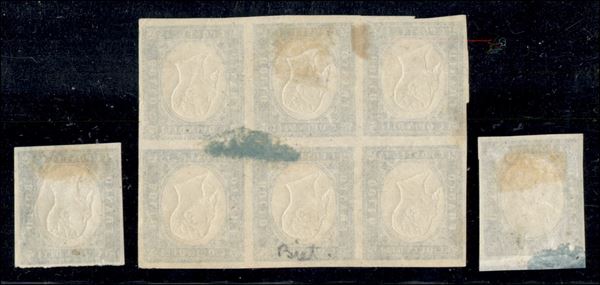 1863 - Prove di Stampa - 15 cent Matraire (11) - singolo senza effigie + blocco di sei e singolo con effigi capovolte