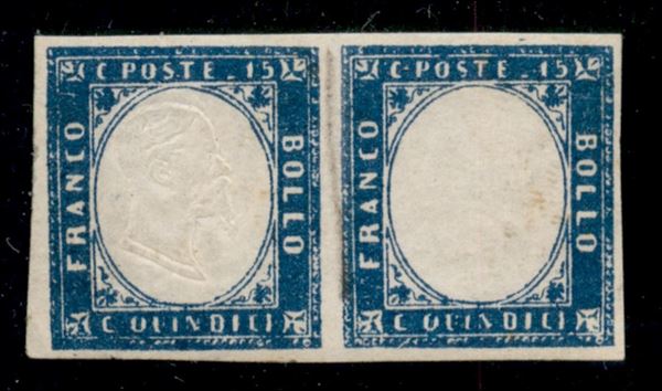 1863 - Senza Effigie - 15 cent (11n) - coppia con doppia testina a sinistra - gomma originale - Chirici + cert. AG (2.200)