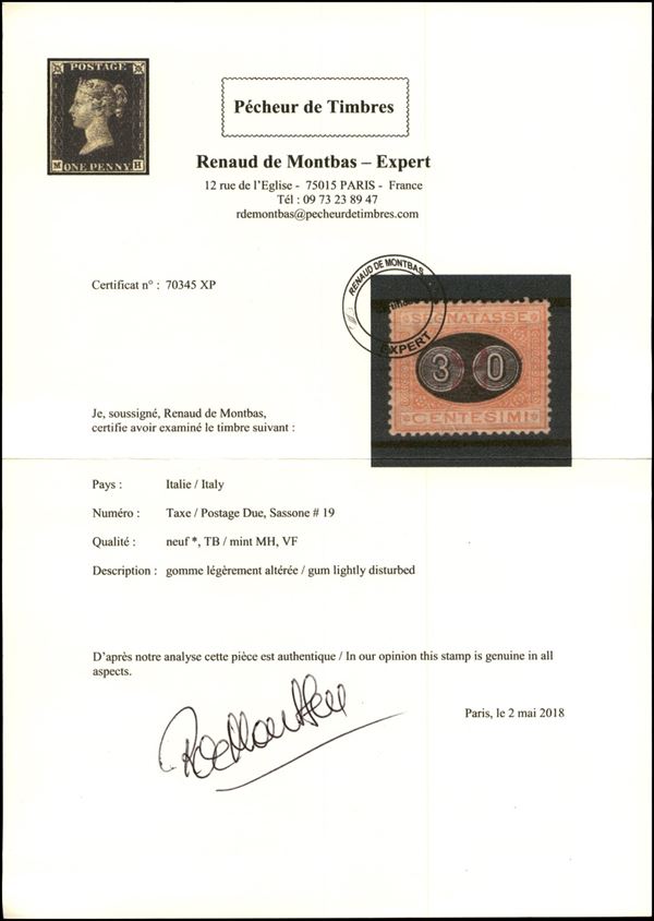 1891 - 30 cent su 2 lire (19) - ottimamente centrato - gomma originale con linguella - cert. Montbas