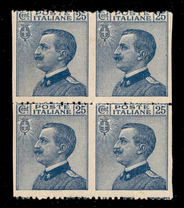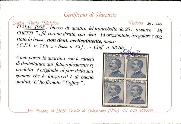 1908 - 25 cent Michetti (83f) - quartina non dentellata verticalmente - gomma integra - cert. Caffaz