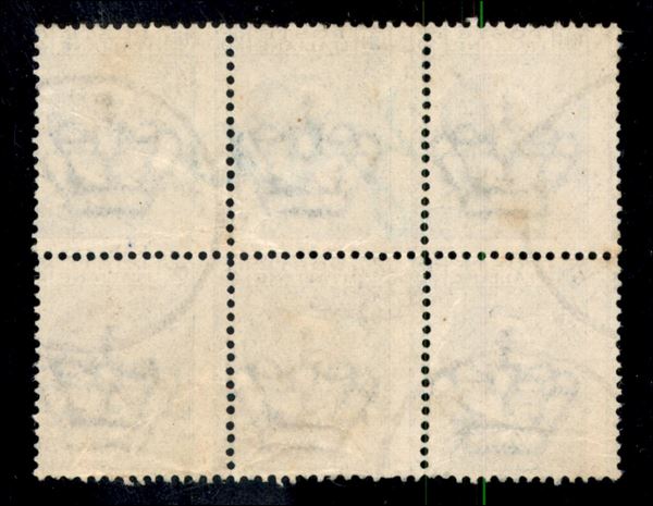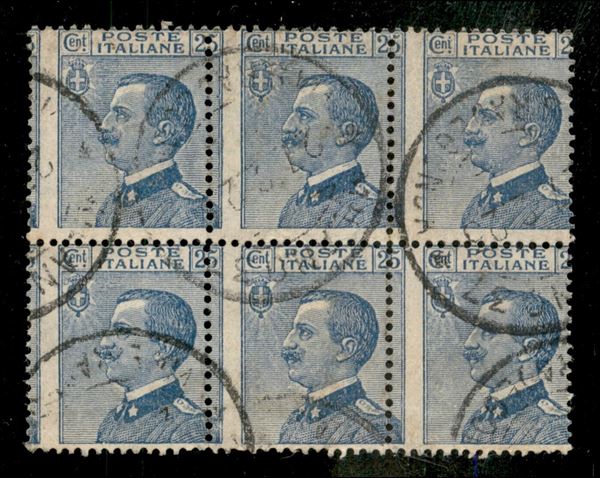 1908 - Michetti blocco di sei 25 cent con dentellatura verticale fortemente spostata a sinistra (83 var.) usato