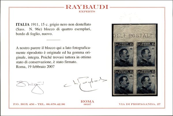 1911 - 15 cent Michetti (96e) - quartina bordo di foglio non dentellata - gomma integra - cert. Raybaudi