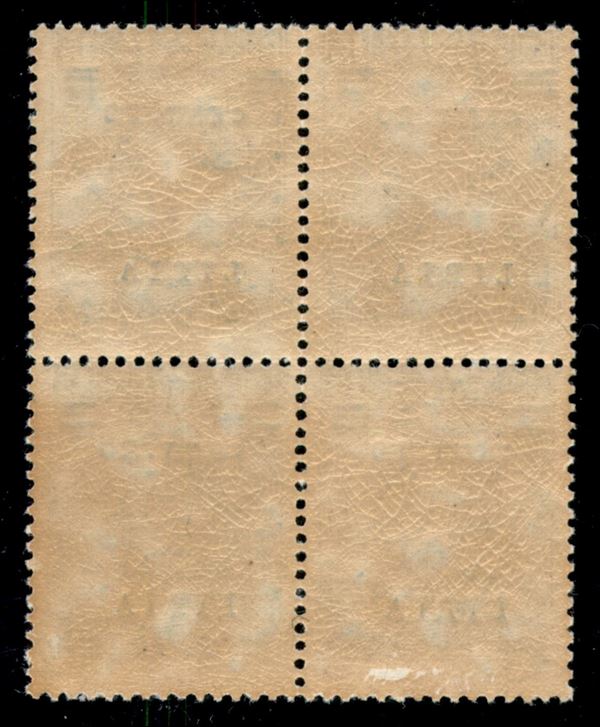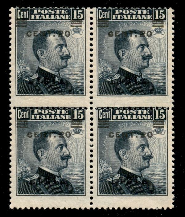 1916 - 20 cent su 15 Michetti (17/Ia) - quartina con soprastampa sposta in basso - gomma integra (3600)