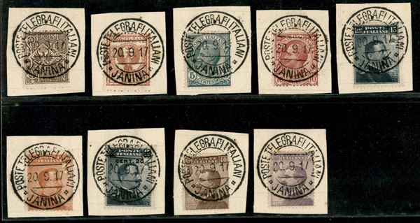 1917 - Poste Telegrafi Italiani Janina 20.9.17 - 9 valori diversi di Regno usati su altrettanti frammenti